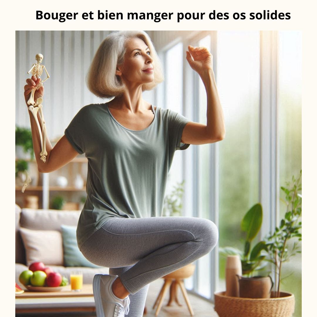 femme d'âge mûr faisant de l'exercice avec un squelette miniature à la main. Elle est vêtue de vêtements de sport et effectue un mouvement de squat dans un espace intérieur lumineux, avec des fruits et une plante en arrière-plan. Un texte en français en haut de l'image dit "Bouger et bien manger pour des os solides