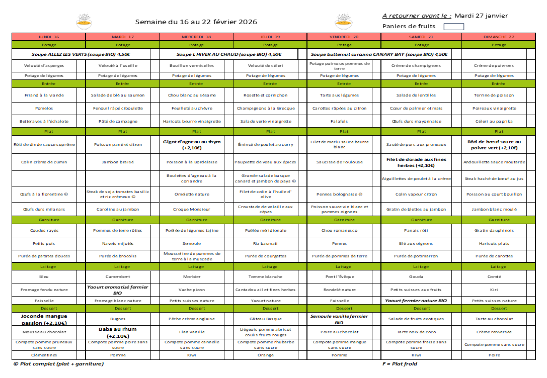 Menus équilibrés du 16 au 22 février 2026 pour allier tradition et nutrition.
