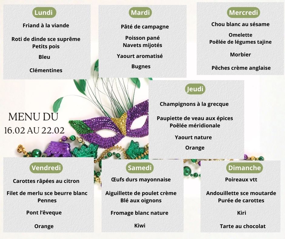 La semaine du 16 au 22 février 2026 s’annonce festive et gourmande avec l’arrivée de Mardi Gras ! À cette occasion, notre équipe de diététiciennes vous propose des menus équilibrés et une carte du moment pensés pour conjuguer plaisir, tradition et équilibre alimentaire. Parce que Mardi Gras rime souvent avec beignets et douceurs.