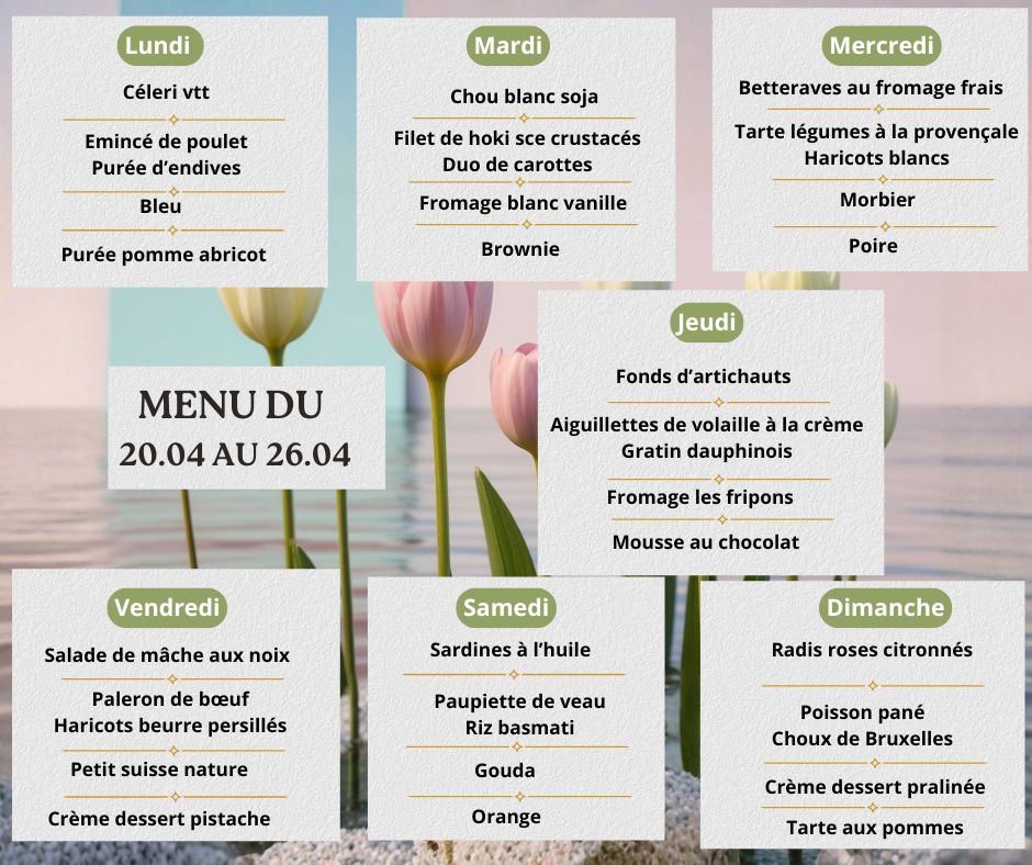 Au printemps, l’alimentation évolue naturellement vers plus de légèreté. Les plats sont moins riches, les cuissons plus douces (vapeur, four, sauté léger) et les recettes mettent davantage en avant les légumes frais. Ces menus sont conçus pour garantir un bon équilibre nutritionnel tout en favorisant la digestion et le bien-être. Ils conviennent à tous, notamment aux seniors, grâce à des textures adaptées et des recettes faciles à consommer.