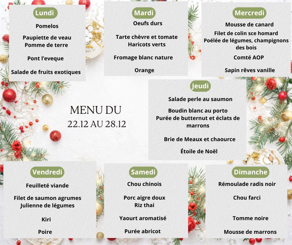 Entre fêtes et repas conviviaux, la fin du mois de décembre est souvent synonyme de gourmandise… mais l’équilibre reste possible ! Pour la semaine du 22 au 28 décembre, notre équipe de diététiciennes vous propose des menus équilibrés pour vous régaler sans excès. Découvrez aussi notre carte du moment, inspirée des produits de saison, et un article pratique pour apprendre à équilibrer son dîner de façon simple, légère et savoureuse.