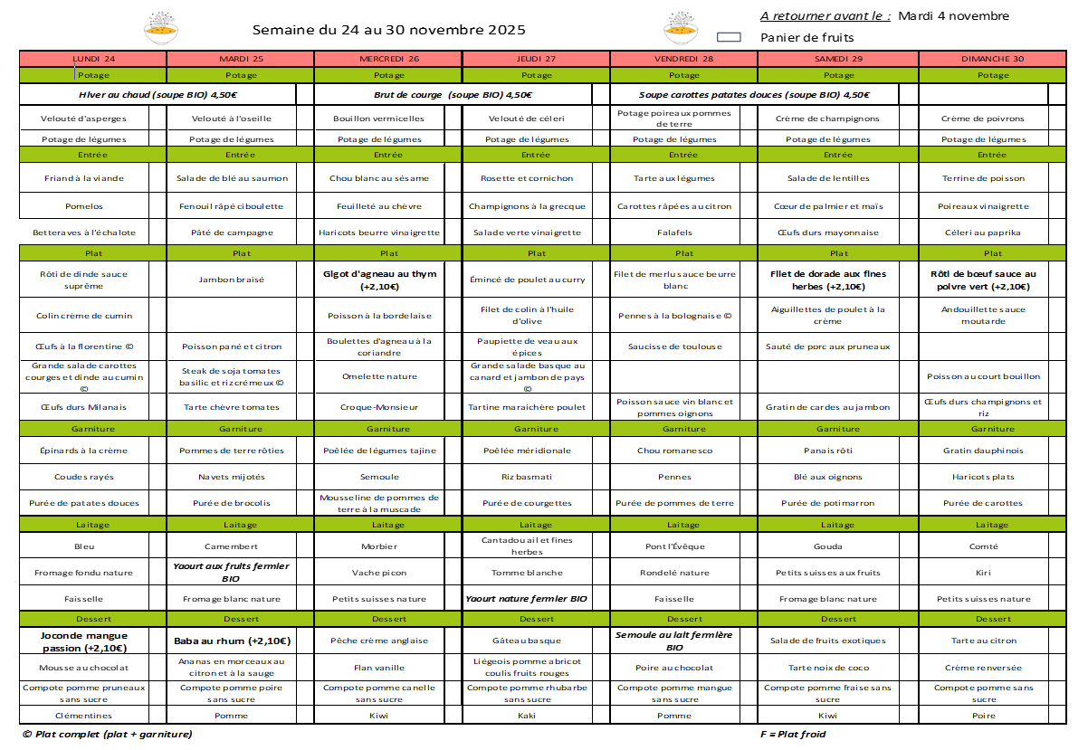 Cette semaine, la carte fait la part belle aux légumes d’automne et aux plats mijotés. Au menu : gratin de potimarron, poisson aux poireaux fondants, compote de pommes maison… Des recettes réconfortantes qui font du bien au corps et à l’esprit.