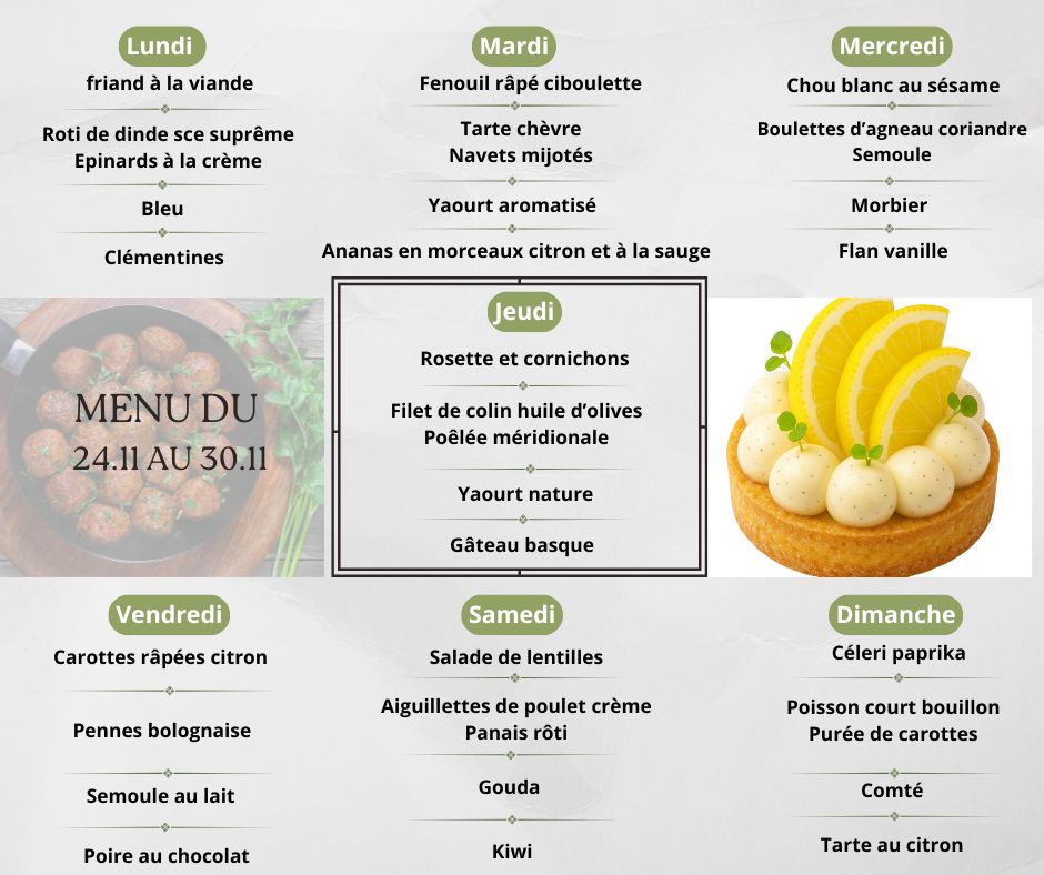 Nos diététiciennes élaborent chaque semaine des menus équilibrés pour garantir un apport nutritionnel complet tout en préservant le plaisir gustatif.