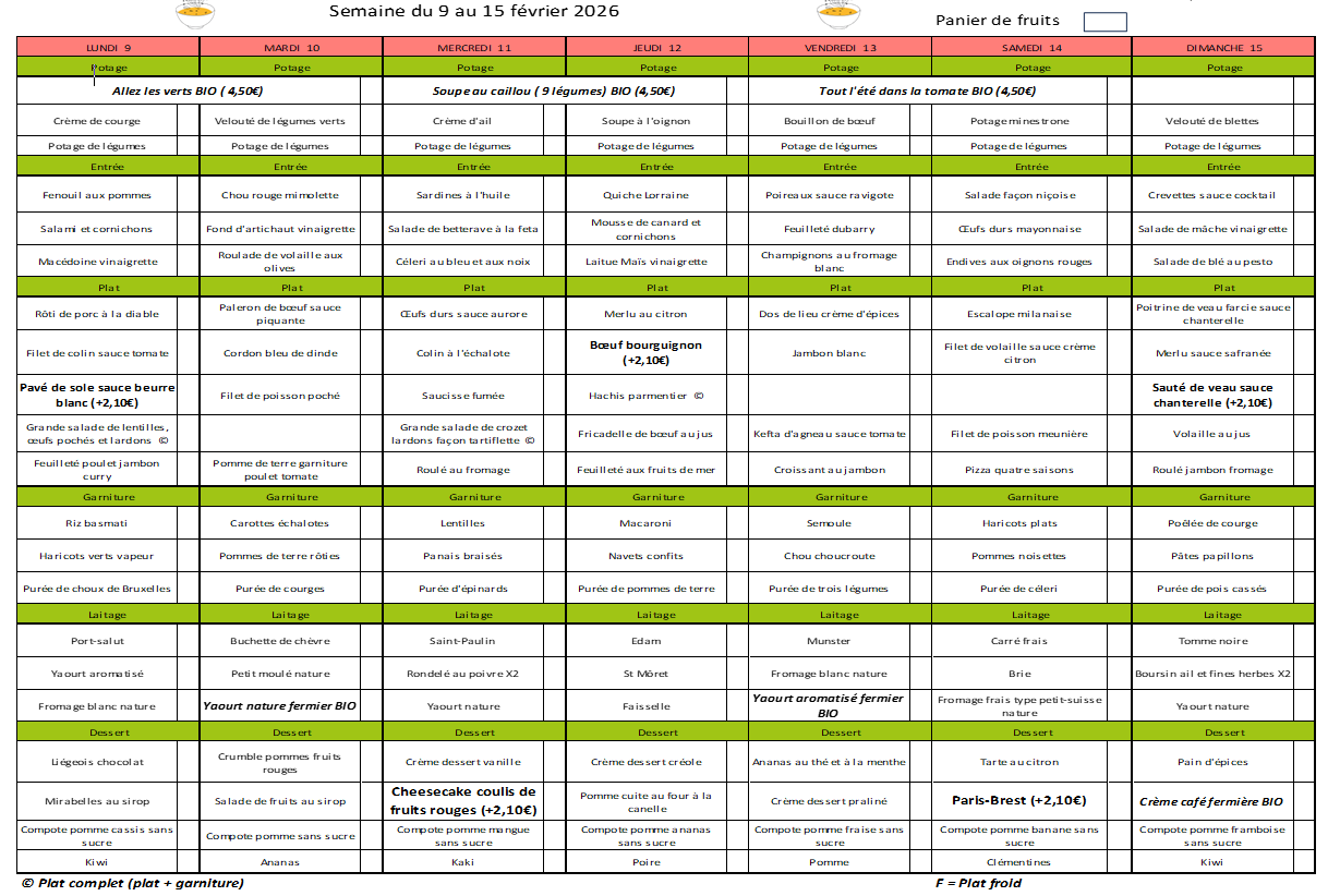 Menus équilibrés du 9 au 15 février 2026.