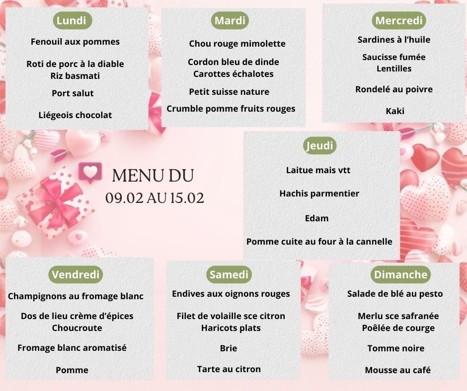 La semaine du 9 au 15 février 2026 s’annonce placée sous le signe du plaisir, du partage et de l’équilibre ! À l’occasion de la Saint-Valentin, notre équipe de diététiciennes a imaginé des menus équilibrés qui allient gourmandise, douceur et bien-être. Parce que le repas de la Saint-Valentin peut être à la fois festif et équilibré, nous vous proposons aussi un éclairage nutritionnel sur l’impact de cette journée si particulière.