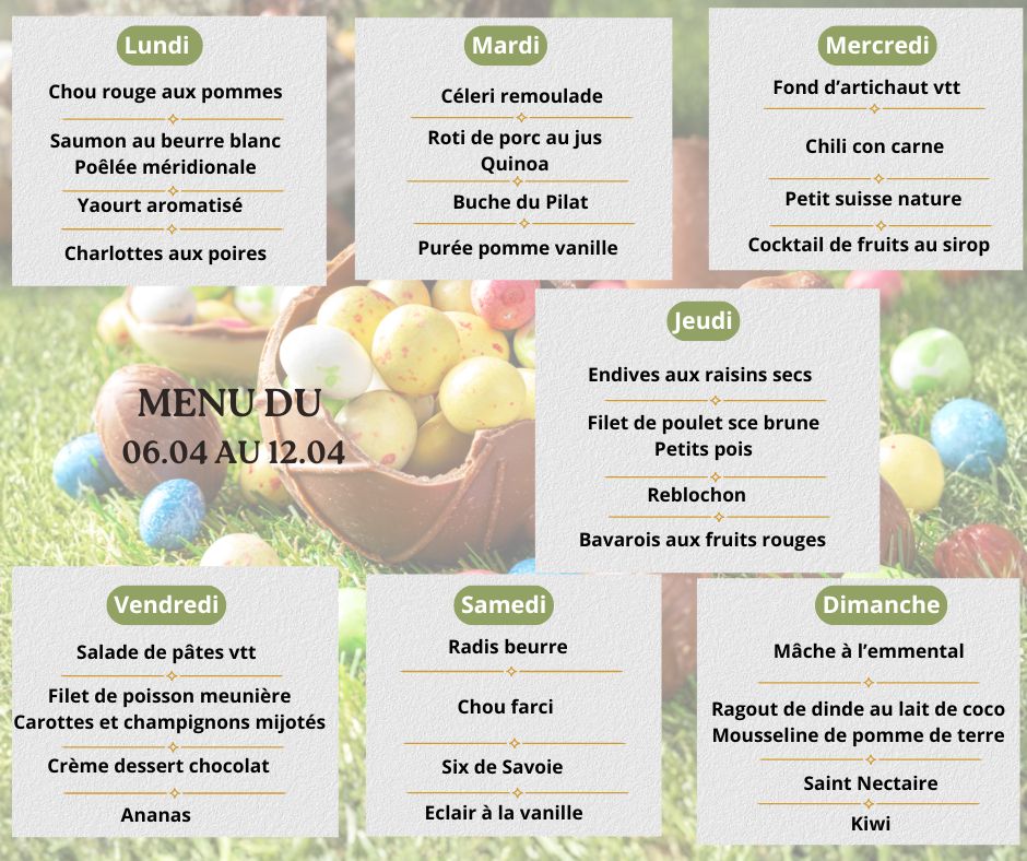 Du 6 au 12 avril 2026, nos menus équilibrés de Pâques s’invitent à votre table pour conjuguer plaisir, tradition et équilibre nutritionnel. Cette semaine un peu particulière, marquée par le lundi de Pâques, est l’occasion idéale de savourer des plats gourmands tout en respectant vos besoins nutritionnels. Notre équipe de diététiciennes a conçu des propositions adaptées à tous, notamment aux seniors et aux personnes souhaitant allier confort digestif et saveurs de saison.