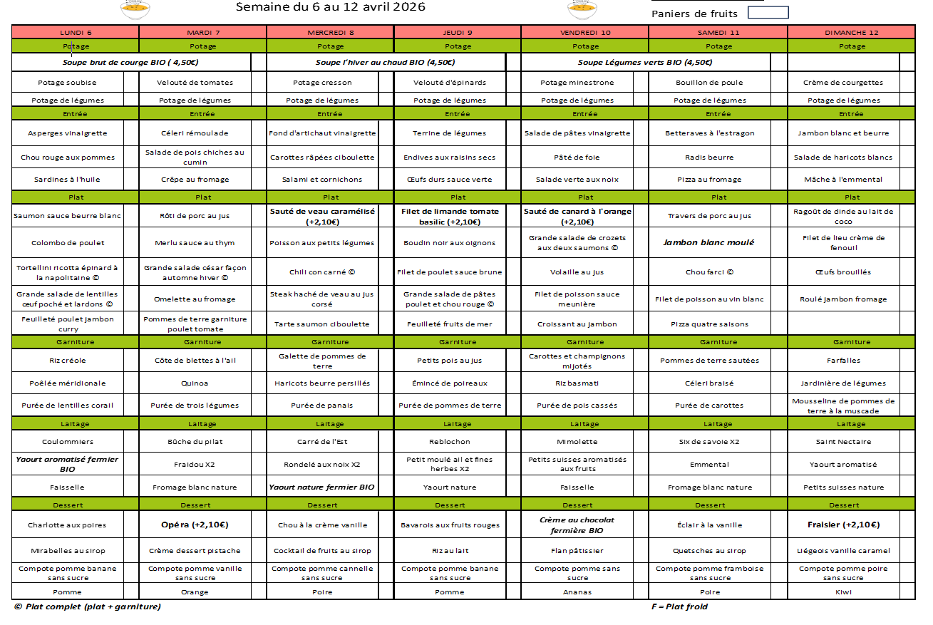 Menus gourmands et équilibrés du 6 au 12 avril 2026.