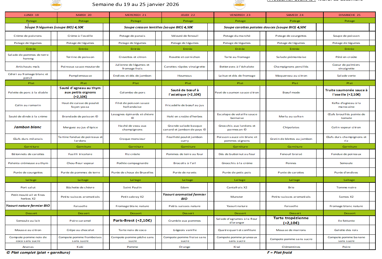 Nos menus équilibrés de la semaine du 19 au 25 janvier 2026.