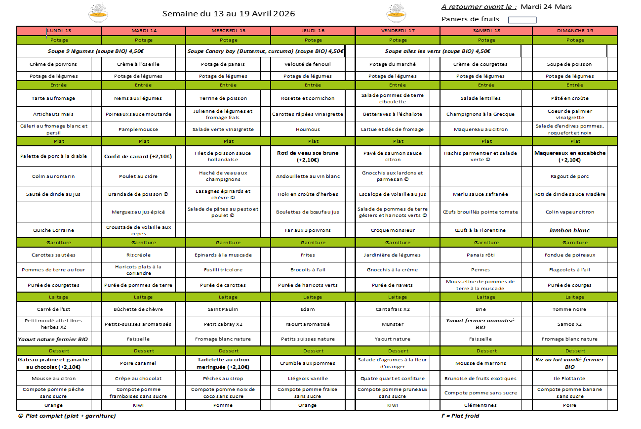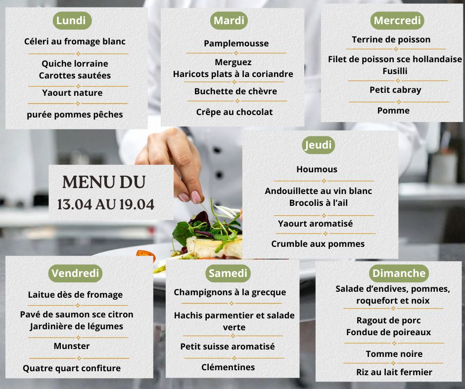 En effet, cette semaine est placée sous le signe de la gastronomie avec des menus équilibrés. Notre équipe de diététiciennes a élaboré des menus complets et variés. Chaque repas associe légumes de saison, protéines de qualité et féculents adaptés afin d’assurer un apport nutritionnel équilibré tout au long de la journée.
